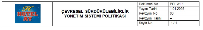 Bu politika, Ay Hotel’in çevresel sürdürülebilirlik taahhütlerini yansıtarak, misafirlerimize konforlu bir konaklama deneyimi sunarken çevreye olan sorumluluklarımızı en üst düzeye çıkarmayı amaçlar. Sürekli iyileştirme ilkesine bağlı kalarak, çevresel performansımızı sürekli olarak değerlendirir ve geliştiririz.