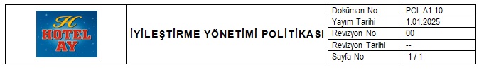 Bu politika, Ay Hotel’in sürekli iyileştirme süreçlerini benimseyerek, sürdürülebilirlik hedeflerine ulaşma çabalarını destekler. Sürekli iyileştirme ilkesine bağlı kalarak, iş süreçlerimizi optimize eder ve paydaşlarımıza daha iyi hizmet sunmayı amaçlarız.