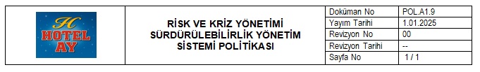 Bu politika, Ay Hotel’in risk ve kriz yönetimi süreçlerini sürdürülebilir bir şekilde yönetmeyi amaçlar. Sürekli iyileştirme ilkesine bağlı kalarak, risk ve kriz yönetimi performansımızı sürekli olarak değerlendirir ve geliştiririz.