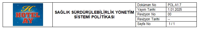 Bu politika, Ay Hotel’in sağlık sürdürülebilirliği taahhütlerini yansıtarak, çalışanların ve misafirlerin sağlığını en üst düzeyde korumayı amaçlar. Sürekli iyileştirme ilkesine bağlı kalarak, sağlık sürdürülebilirlik performansımızı sürekli olarak değerlendirir ve geliştiririz.